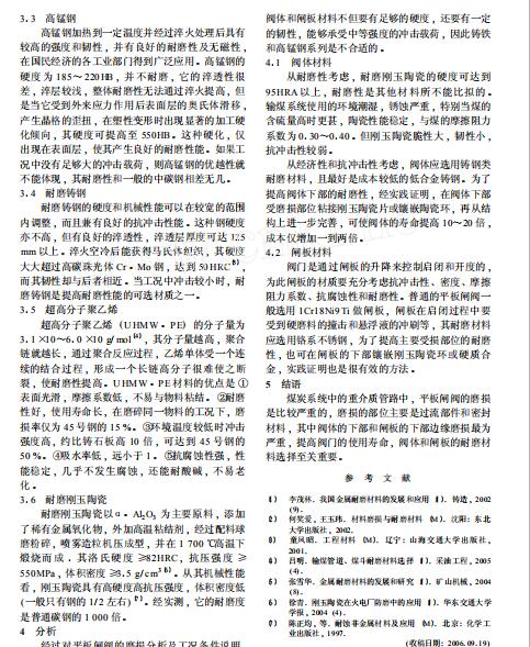 在煤炭系統(tǒng)中的重介質(zhì)管路中,平板閘閥的磨損是比較嚴(yán)重的,磨損的部位主要是過流部件和密封材料,其中閥體的下部和閘板的下部邊緣磨損最為嚴(yán)重,提高閥門的使用壽命,閥體和閘板的耐磨材料選擇至關(guān)重要。